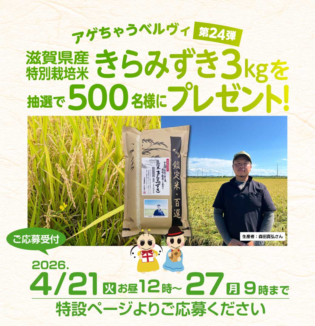 今回プレゼントするのは、『滋賀県産「きらみずき」(特別栽培米)3kg』!