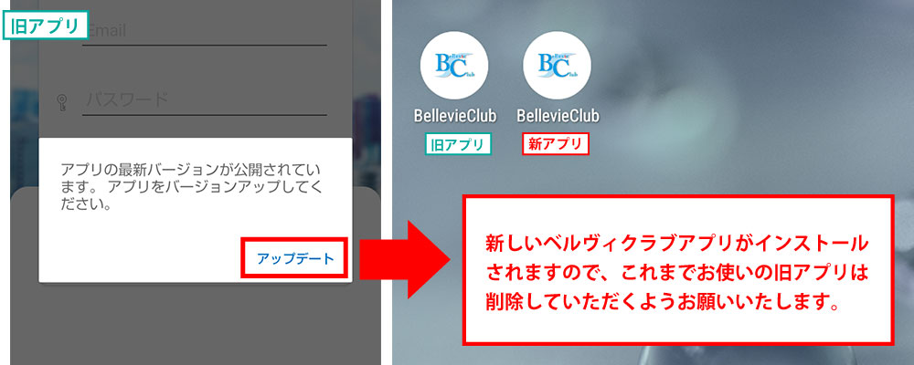 そのままポップアップをタップし、新しいベルヴィクラブアプリをインストールしてから、再度ログインしてご利用ください。